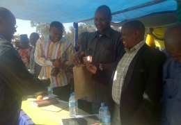 Mkurugenzi mtendaji wa wilaya ya Kiteto Bw. Tamim H. Kambona akimkabidhi fedha Mwenyekiti wa Halmashauri ya wilaya ya Kiteto Mhe. Lairumbe Mollel kwa ajili ya kuzizawadia shule...