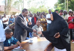 Mkuu wa wilaya ya Kiteto Mhe. Tumaini Magessa akigawa vitambulisho kwa wafanyabiashara wadogo ,wakati wa uzinduzi wa zoezi la ugawaji wa vitambulisho hivyo uliuofanyika katika mji mdogo wa Kiba...