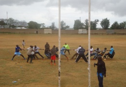 Watumishi wa serikali kuu na serikali za mitaa wakishindana kuvuta kamba wakati wa bonanza lililofanyika kama sehemu ya maadhimisho ya siku ya uhuru wa Tanzania bara.Bonanza hilo limefanyika katika uw...